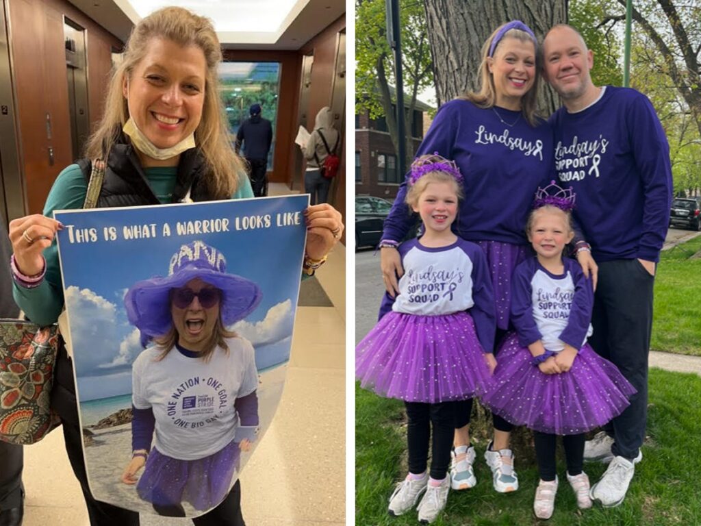 (Left) Lindsay Gavin, who was diagnosed with stage 4 pancreatic cancer at age 40. (Right) Gavin and her family dressed up for the Purple Stride.Lindsay Gavin