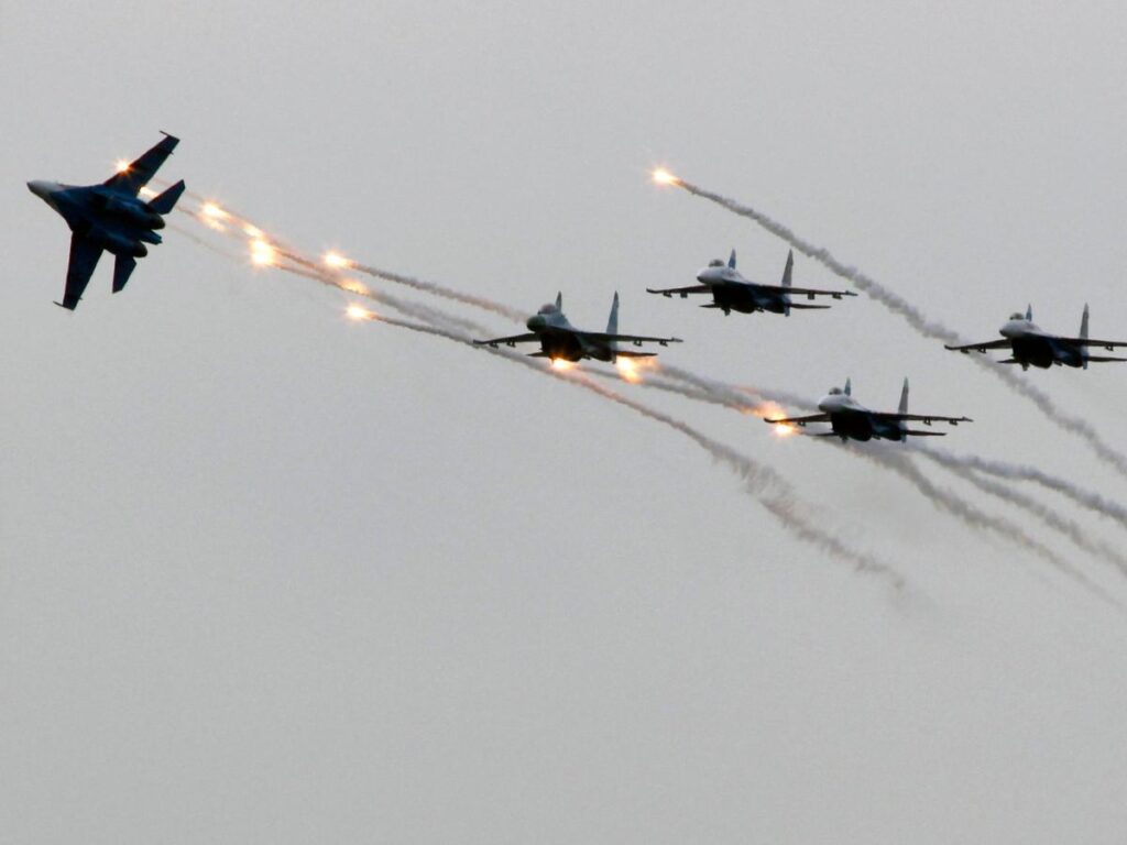 Russian Air Force Su-27 jet fighters perform during the 2011 MAKS International Aviation and Space Salon in Zhukovsky.REUTERS/Sergei Karpukhin