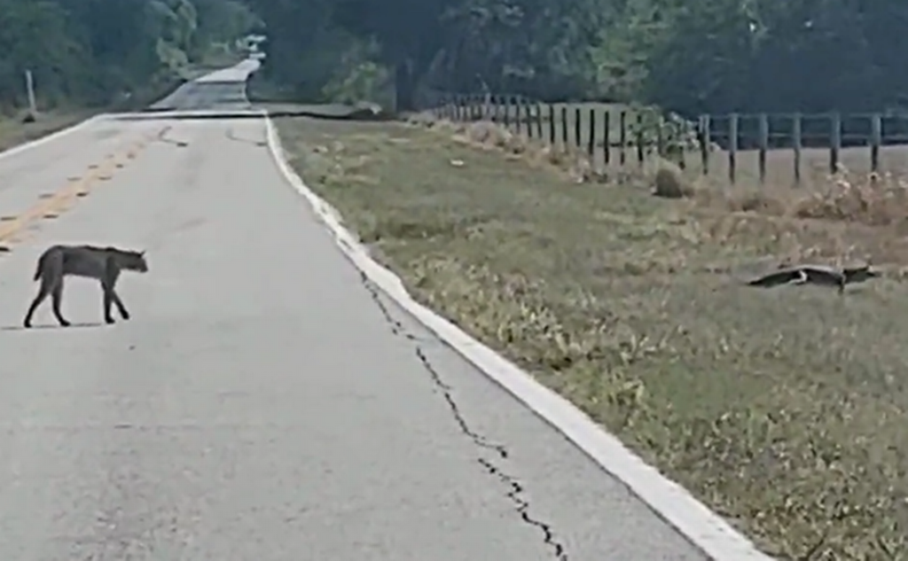 Brave bobcat stalking alligator across road has second thoughts, Florida video shows