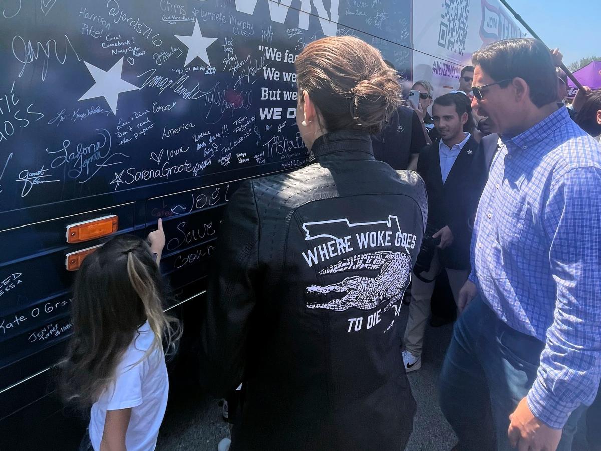 The couple on Saturday attended their first Roast and Ride, an annual event hosted by Sen. Joni Erst, in Des Moines, where Casey wore a leather coat emblazoned with an illustration of an alligator over an outline of the state of Florida, along with a statement that echoes one of her husband’s key campaign messages: “Where Woke Goes to Die.“