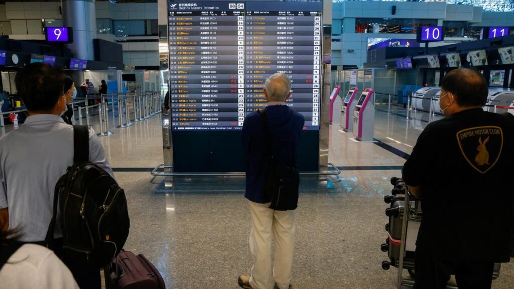 People watch a fight information board, as China’s no fly and no shipping zone comes into force in the East China Sea to the north of Taiwan, at Taoyuan International Airport in Taoyuan, Taiwan April 16, 2023.