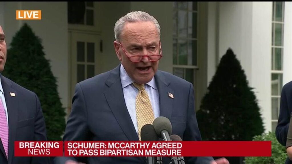 Sen. Chuck Schumer says common ground has to be found to reach a deal on the debt ceiling. He says everyone understands a default would be a disaster. Schumer spoke to reporters after meeting with Republican leaders in the Oval Office. Follow Bloomberg for business news & analysis, up-to-the-minute market data, features, profiles and more: http://www.bloomberg.com Connect with us on… Twitter: https://twitter.com/business Facebook: https://www.facebook.com/bloombergbusiness/ Instagram: https://www.instagram.com/quicktake/?hl=en