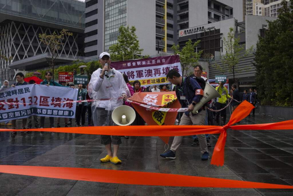 On Sunday, about 80 people expressed their opposition to the plans in Tseung Kwan O, a residential and industrial area, the organizer said. They had to walk in a cordoned-off moving line in the rain amid heavy police presence.