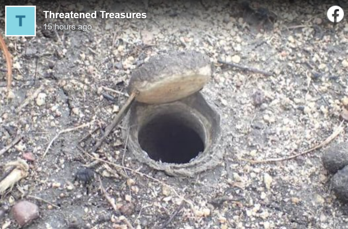 Photos shared on Facebook by Threatened Treasures show the animal’s circular, almost pipe-like burrow with a “door” made of silk and soil.