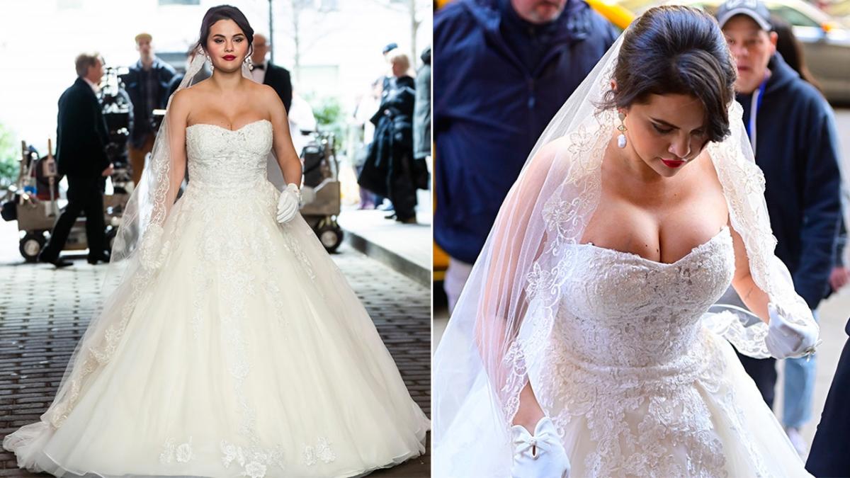 Selena Gomez is seen filming “Only Murders in the Building” in a lace wedding gown.