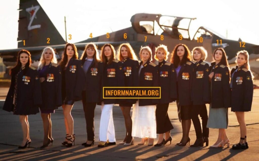 A group shot released as part of the report showed 12 military spouses wearing their partners’ uniforms and medals with an Su-25 jet in the background.