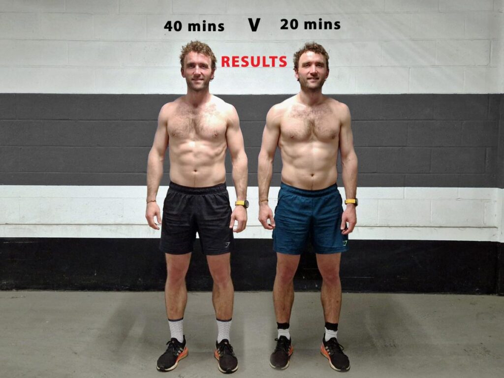 Hugo worked out for 20 minutes at a time and Ross worked out for 40 minutes, comparing their strength, fitness, and body composition over 12 weeks.