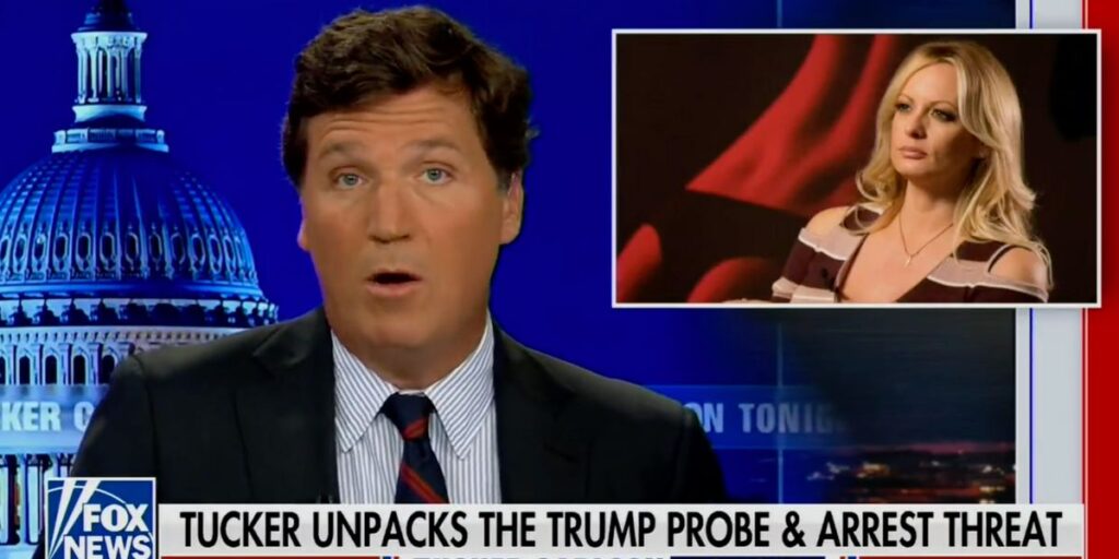 Tucker Carlson has jumped to Donald Trump’s defense as a possible indictment of the former president looms over hush money payments made to adult film star Stormy Daniels in 2016.