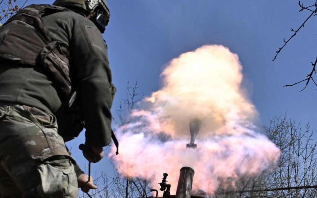Belarusian volunteer soldier from the Kastus Kalinouski regiment, a regiment made up of Belarusian opposition volunteers formed to defend Ukraine, fires a 120mm mortar round at a front line position near Bakhmut in the Donetsk region