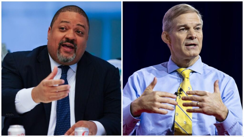 Alvin Bragg sitting wearing suit on left and Jim Jordan wearing yellow tie on right
