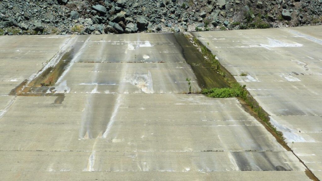 There is a patch of vegetation growing on the face of Shasta Dam in an area where water seeps out from the seams in the concrete.